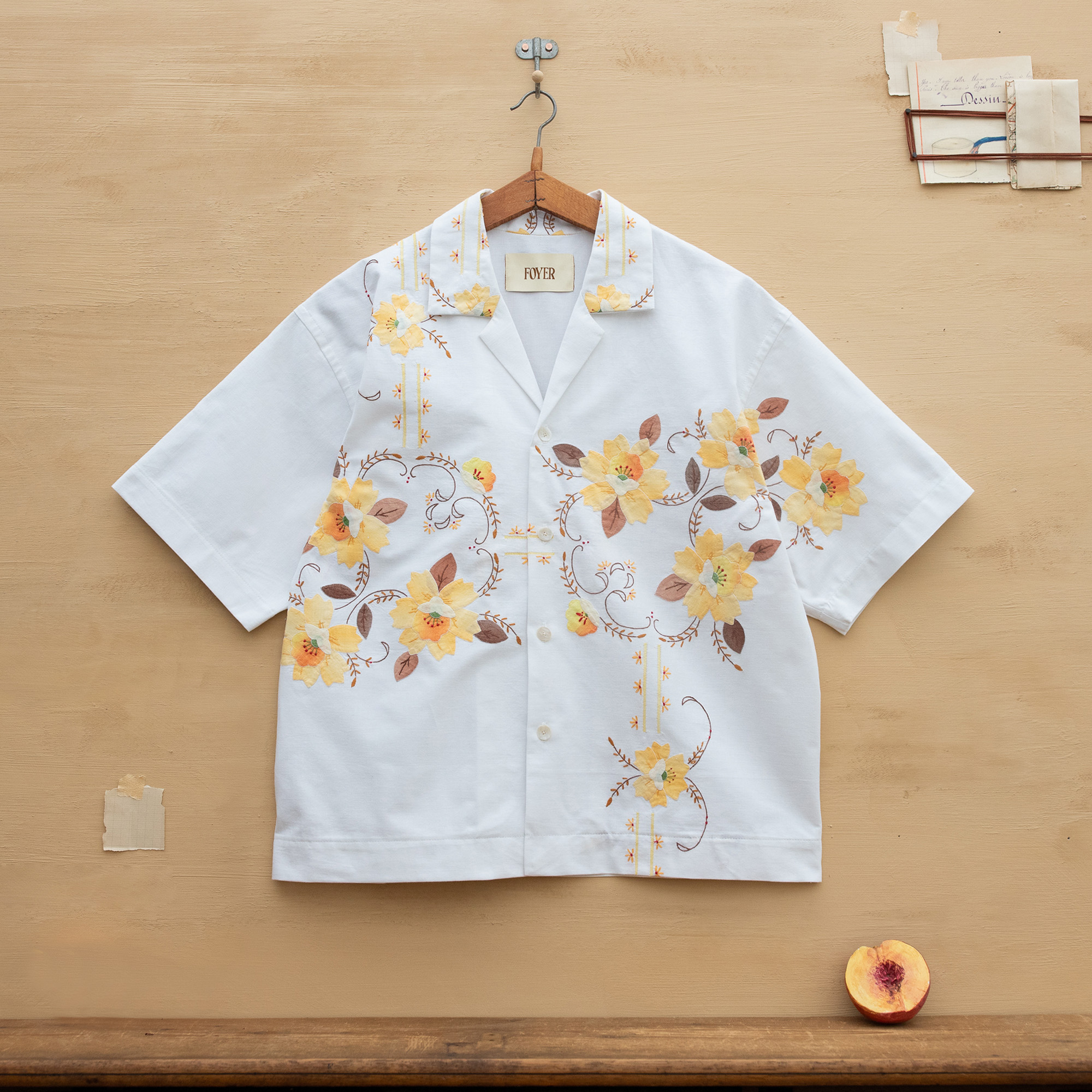 This shirt is made from a vintage French tablecloth with hand-embroidered flowers on a cotton canvas fabric. The buttons are mother-of-pearl.